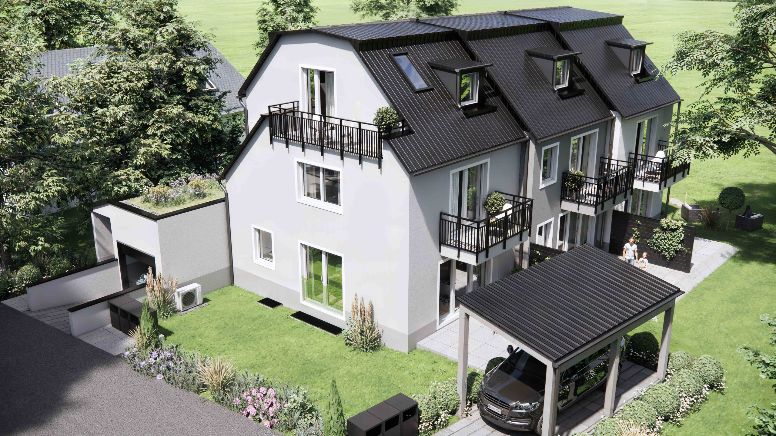 In einer ruhigen, gewachsenen Wohnstraße im grünen Stadtteil Moosach entsteht ein exklusiver Dreispänner, der anspruchsvolle Architektur, moderne Energieeffizienz und außergewöhnlich großzügiges Wohnen auf harmonische Weise vereint.