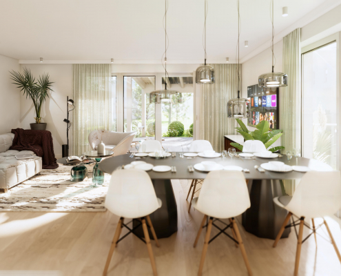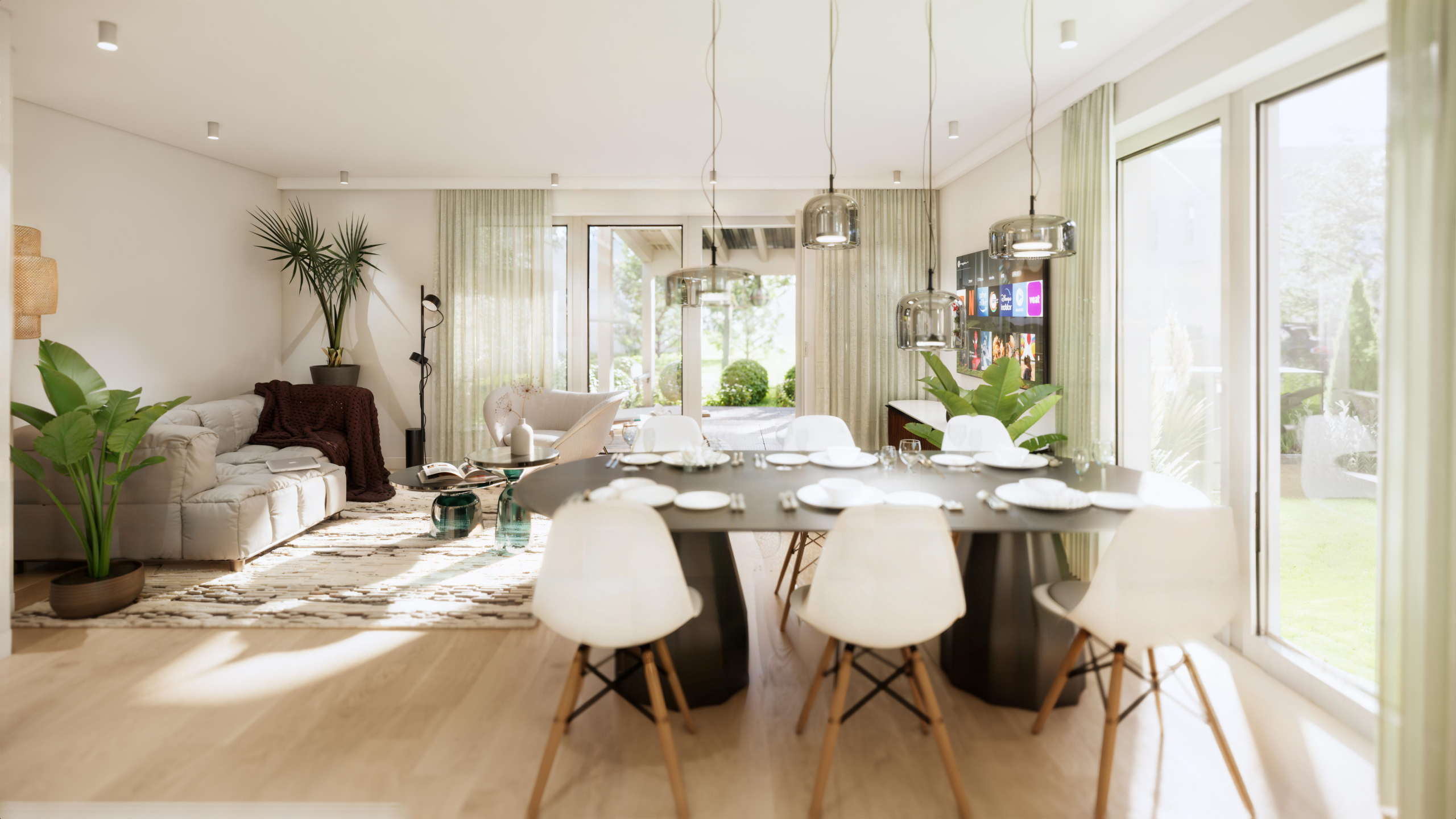Im Inneren entfaltet sich ein durchdachtes Raumkonzept, das den Alltag intuitiv begleitet. Die kommunikativen Grundrisse verbinden Offenheit mit klaren Strukturen: Wohnen, Essen und Kochen gehen fließend ineinander über und bilden den lebendigen Mittelpunkt des Hauses. Hier findet Begegnung und Austausch statt, kreieren Sie hier neue gemeinsame Momente – ob im Familienkreis oder mit Gästen.